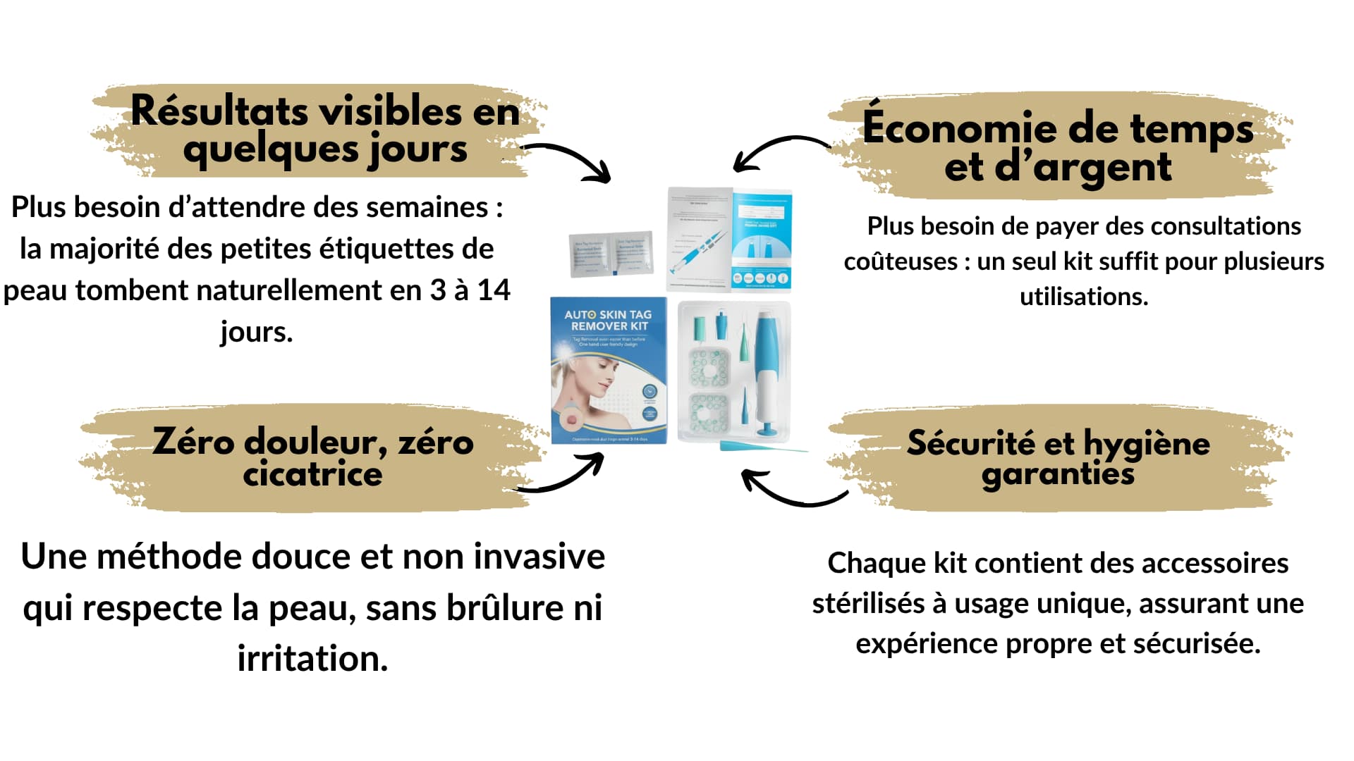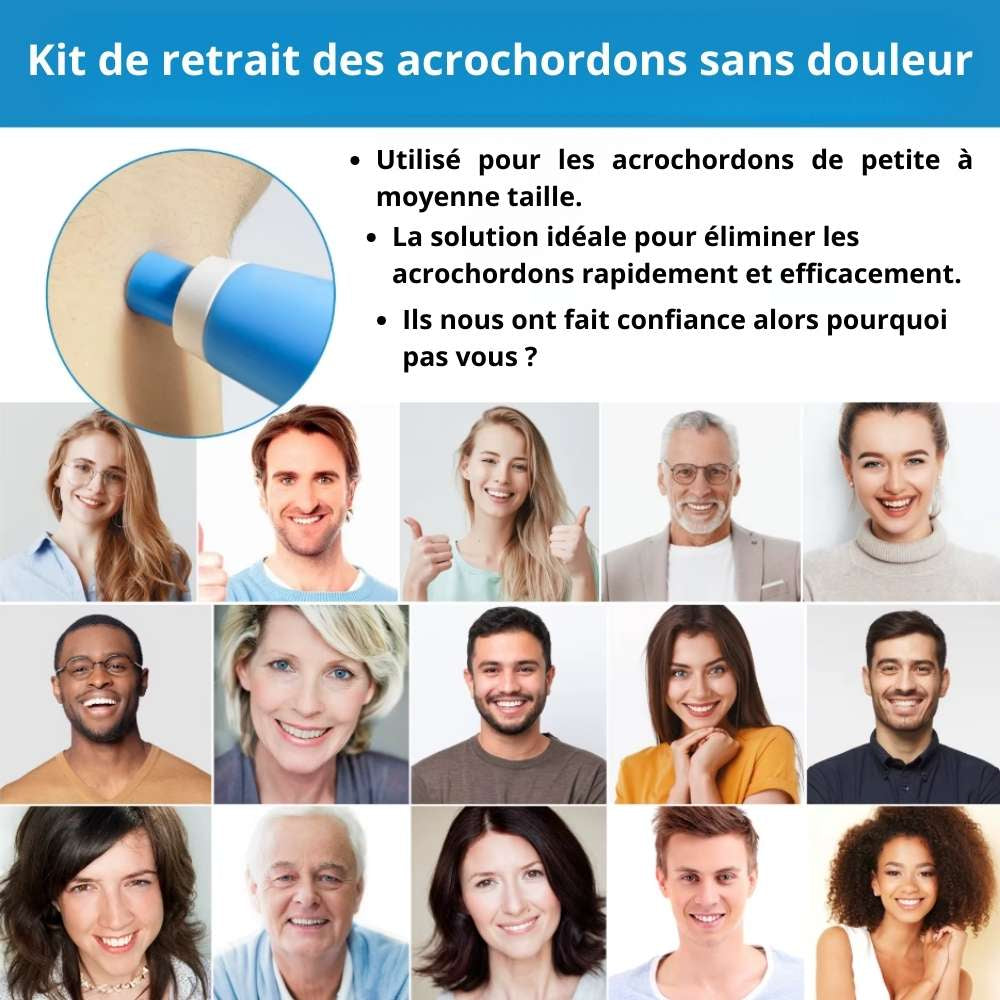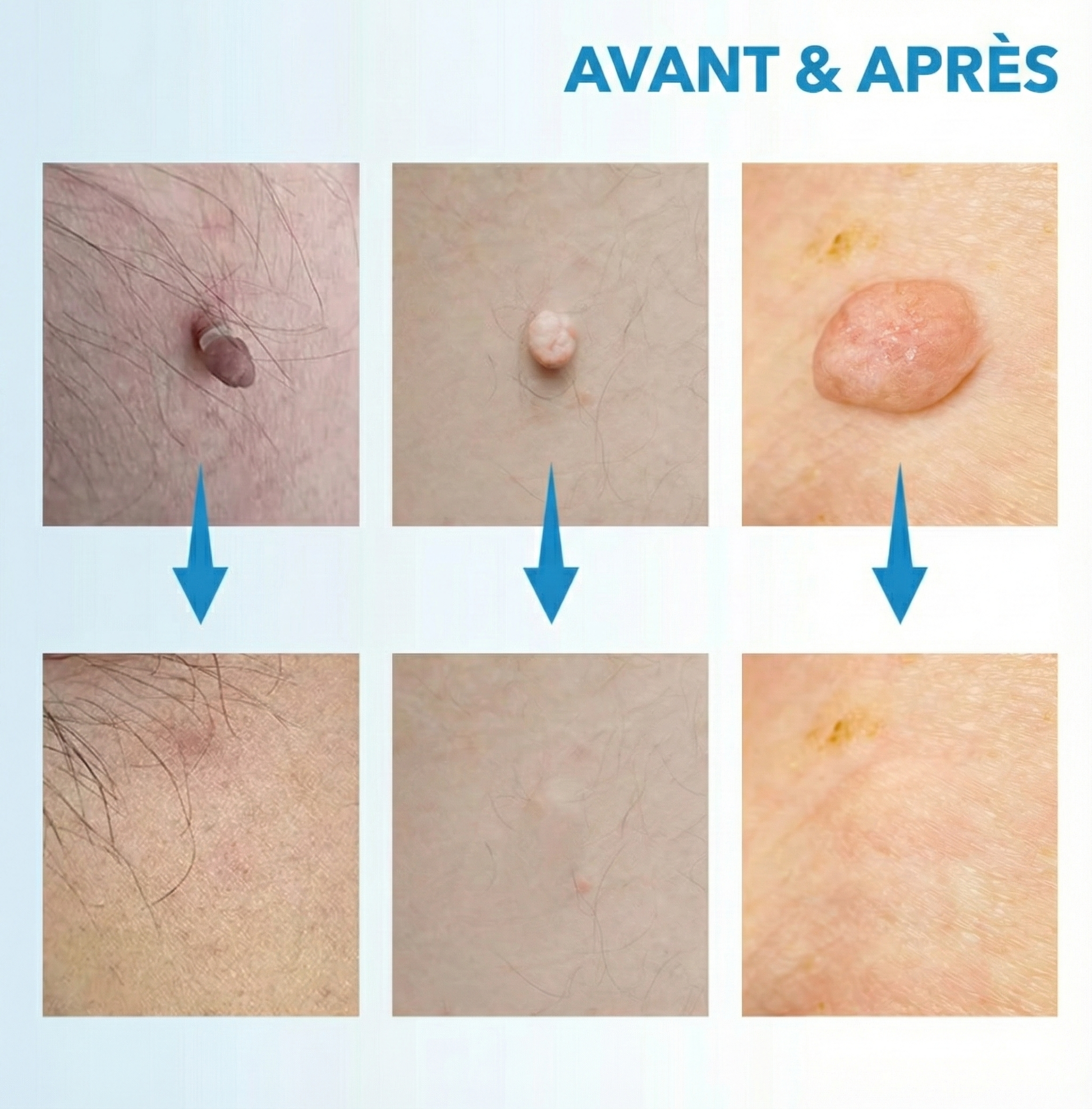 Uniquement pour les skin tags / acrochordons (petites excroissances molles, couleur peau).